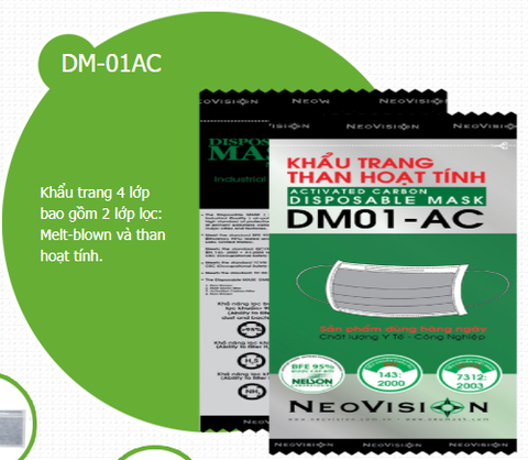 Khẩu trang y tế DM-01AC Ứng dụng: Môi trường y tế. Môi trường công nghiệp. Phòng mạch, nha si..... Cấu tạo: Lớp vải không dệt (Non - woven) ở mặt trong và mặt ngoài. Lớp lọc bụi & vi khuẩn. Lớp than hoạt tính ép trong vải (Activated Carbon Nonwoven). Khẩu trang y tế gồm 3 lớp được làm bằng vải không dệt, có khả năng ngăn chặn các các hạt bụi nhỏ và khủ mùi MH TECHGREEN chuyên cung...
