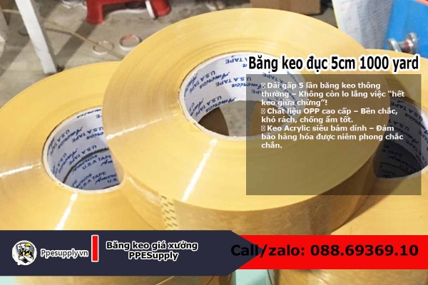 ➡️ Tại PPESupply, băng keo đục 5cm có sẵn nhiều độ dài từ 100 đến 1000 yards, chất keo chắc, độ dày chuẩn, đảm bảo không bong tróc.