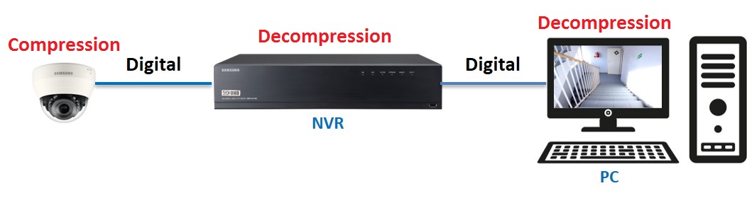 NVR nhận các video ở định dạng kỹ thuật số để ghi lại và truyền đến máy tính có phần mềm giám sát cụ thể.