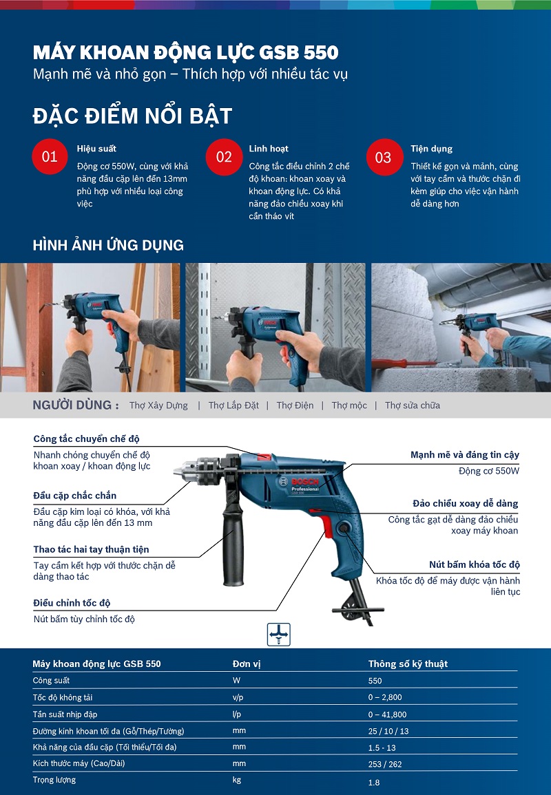 - Lựa chọn khoan 2 chế độ: khoan xoay, khoan động lực