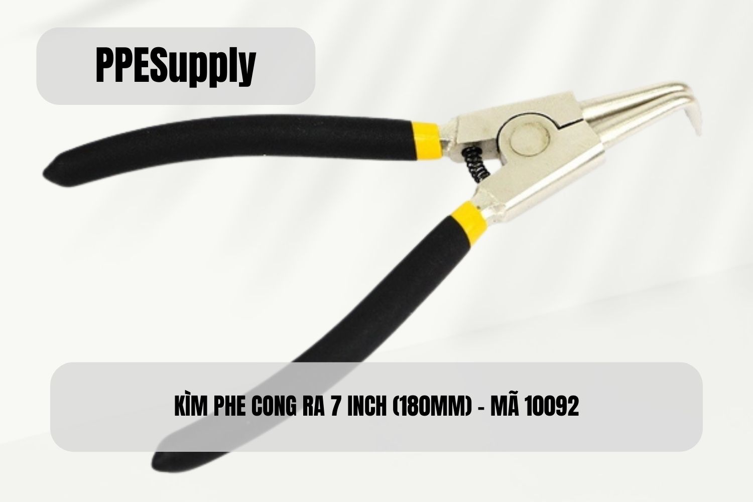 Kìm phe cong ra 7 inch (180mm) Dùng cho phe (vòng hãm) ngoài Mũi cong 90 độ, phù hợp vị trí khuất Thép Cr-V mạ niken, chống gỉ Tay cầm nhựa, có lò xo trợ lực