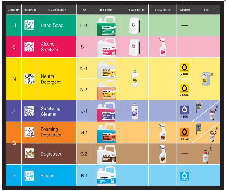 Bảng qui chuẩn làm việc với hóa chất của Saraya (CSS) giúp công việc quản lý vệ sinh rõ ràng hơn. Ban quản lý dễ dàng có bảng hướng dẫn dựa trên các màu sắc trên bảng để qui định và đào tạo nhân viên vệ sinh bài bản, càng hiệu quả khi bạn có một đội nhân viên quá đông. Bảng hướng dần kèm màu sắc dễ hiểu giúp bán dễ dàng hơn cho việc quản lý và đào tạo hệ thống nhân viện vệ sinh mình khi làm việc với chất tẩy rửa và máy móc thiết bị đi kèm. Tránh được các nhầm lẫn khi sử dụng chất tẩy rửa, xử lý hóa chất thải ra đúng cũng mang lại hiệu quả cao trong an toàn môi trường. Saraya có hệ thống sản phẩm thiết kế rất thân thiện người dùng.